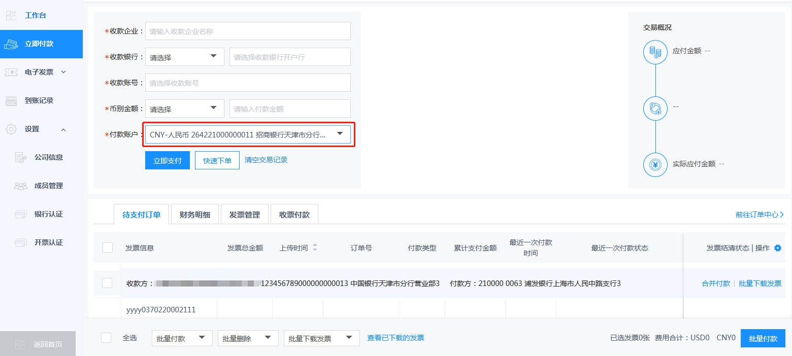 结算企业认证通过后,可在荣e通平台使用招商银行进行付款。