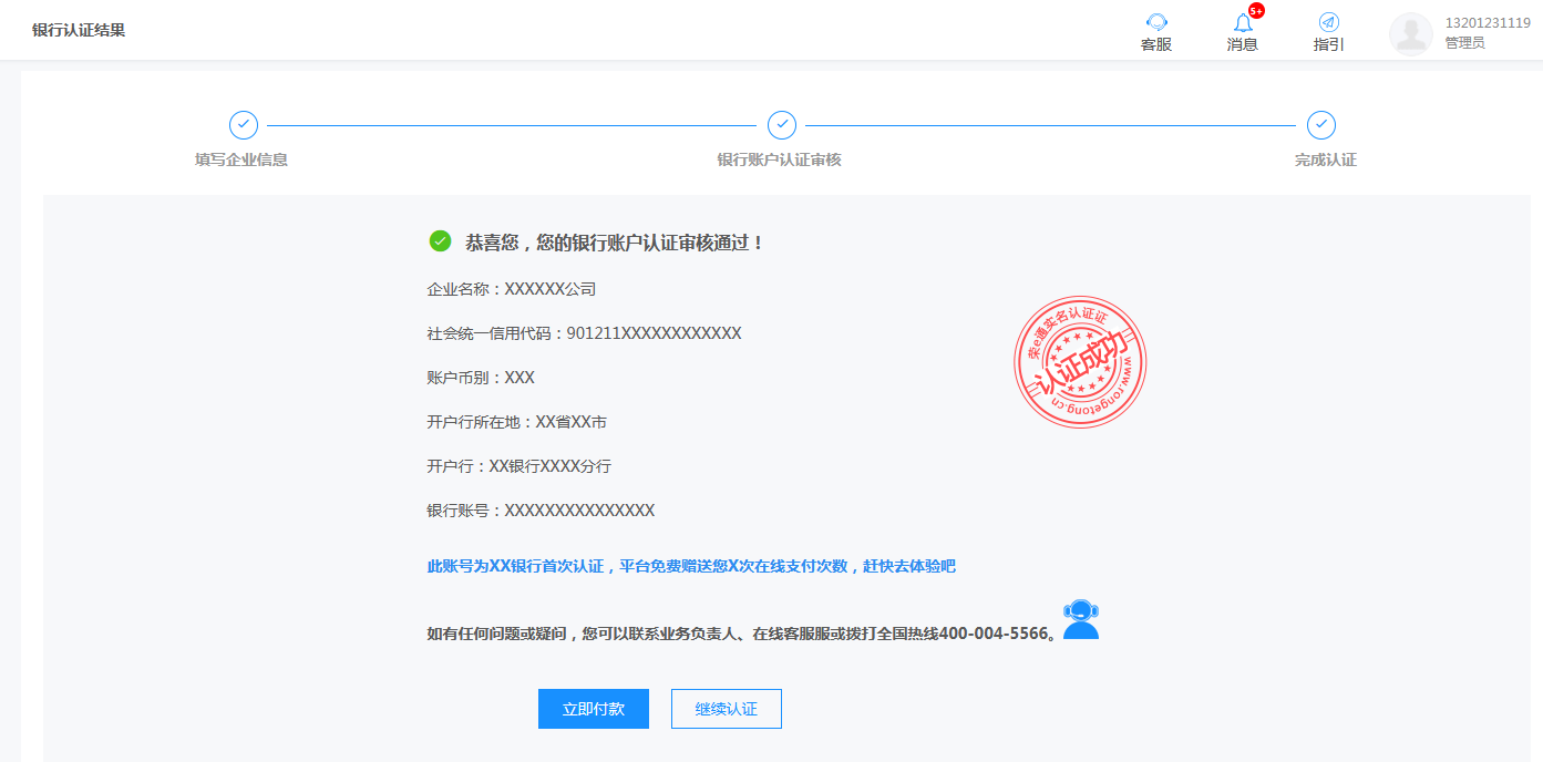 结算企业提交认证后,招商银行将系统校验银行账户认证信息及对应线下签约的匹配情况,及时给予认证反馈。