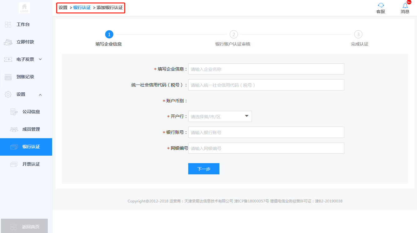 3.登录荣e通平台提交企业账户信息
